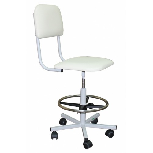 Каркас изготовлен из стального профиля с нанесением экологически чистой эпоксидной полимерно-порошковой краски, устойчивой к регулярной обработке дезинфицирующими и моющими средствами. Стандартный цвет каркаса - светло-серый полуматовый. Верхний элемент изготовлен с применением винилискожи, устойчивой к истиранию и воздействию дезинфицирующих средств. Опорные колеса пятилучья имеют двойные прорезиненные ролики. Хромированное кольцо для опирания ног регулируется по высоте.