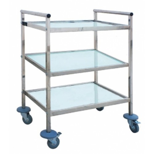 Каркас изготовлен из нержавеющего тонкостенного профиля. Поверхность стола - глянцевая. Установлен на поворотные самоориентирующиеся колеса - 75 мм. Конструкция стола разборная.
