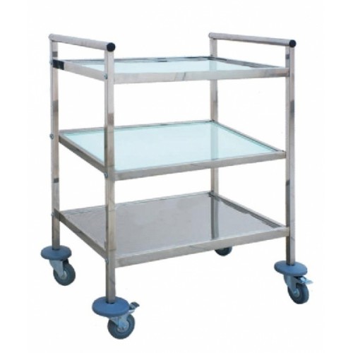Каркас изготовлен из нержавеющего тонкостенного профиля. Поверхность стола - глянцевая. Установлен на поворотные самоориентирующиеся колеса - 75 мм. Конструкция стола разборная.