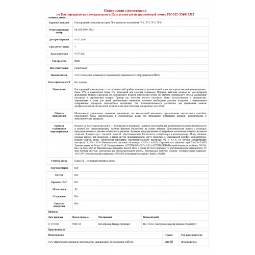 Концентрация кислорода на выходе (при производительности ≥ 5 л/мин): ≥ 93±3%