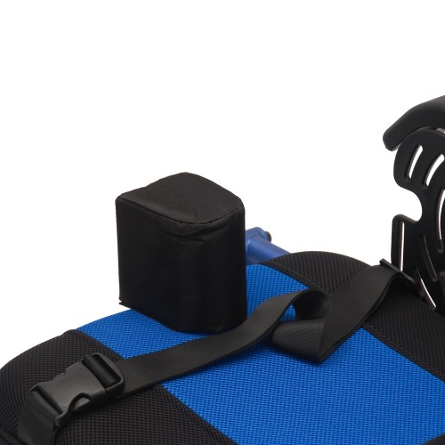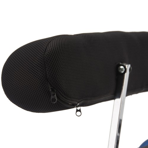 Спинка оснащена мягким, регулируемым по высоте подголовником, боковыми фиксаторами туловища, а также системой регулировки угла наклона до положения «лежа».