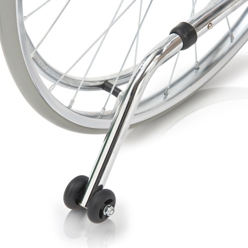 Кресло-коляска оснащена колесами, имеющими цельнолитые задние и передние шины.