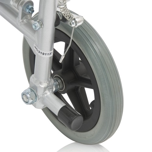 Кресло-коляска оснащена колесами, имеющие задние и передние цельнолитые шины.